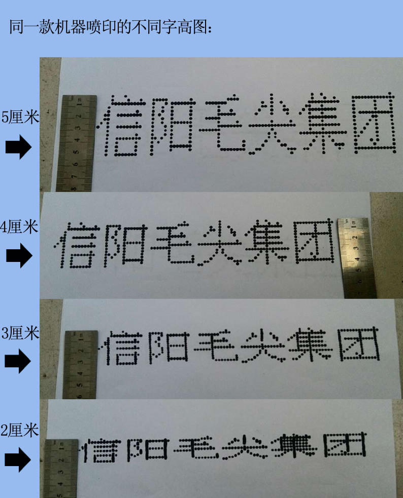 產(chǎn)品特點: 1、體積小巧,機(jī)身重2.6Kg,噴頭超輕。 2、字符高度任意調(diào)節(jié)5MM-60MM區(qū)間任意調(diào)節(jié) 3、拼音輸入法,操作方便 4、氣液分離,保證氣泵氣路不被墨水堵塞 5、四輪設(shè)計,可噴平面,弧面,管壁,等任何不規(guī)則面 6、輪距可調(diào),可卡不同粗細(xì)管徑的管材 7、4.3寸彩色液晶屏,人性化操作 特殊功能介紹:1、機(jī)器特有的高度調(diào)節(jié)功能,噴頭設(shè)計為圓形,所以可以將噴頭調(diào)節(jié)一個角度,然后在主機(jī)里設(shè)定一個跟這個角度相對應(yīng)的斜率,通過編碼器給出同步信號,打印出比原字高矮的字符來,值得提出的是改變字符高度的同時不減少噴印的點數(shù),如圖所示:
